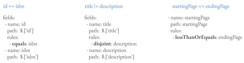 We can compare data element values, such as the title should be different than the description (which is a frequent problem in aggregated collections such as Europeana), or the first page number of a paper should be less than or equal to the last one.
