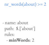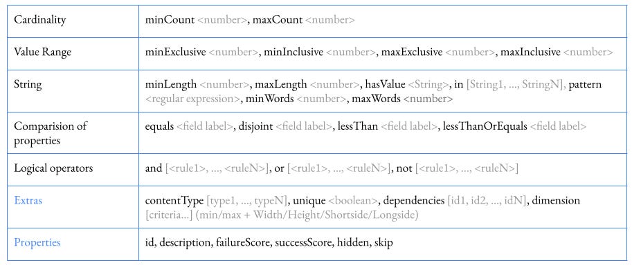 As mentioned before real life scenarios required to extend the original rule set. Here are four of them: checking the content type – that issues an HTTP call; checking if a value is unique – that requires a preliminary indexing, that is also part of the tool; setting dependencies between constraints – for example check value of an optional element only it is available; and checking dimensions of an image.