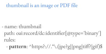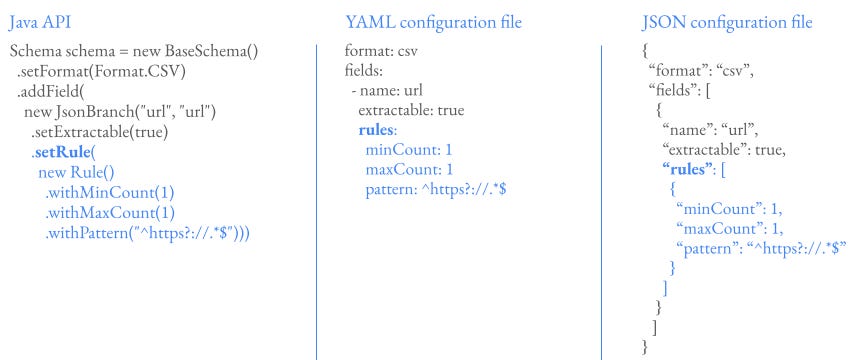 These rules can be set in a ‘schema’ that describes all metadata elements we analyse – so it does not necessarily describe all elements available in the metadata schema. This schema can be expressed via a Java API, with YAML or JSON configuration files. This example sets that the file to analyse is a CSV file, and we are interested in a single property: there should be one and only one URL and it should start with ‘http’ or ‘https’.