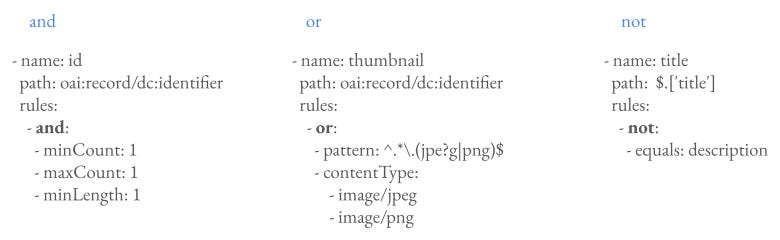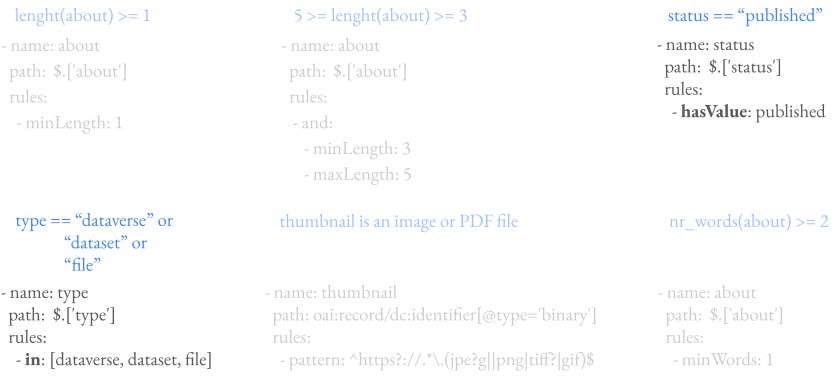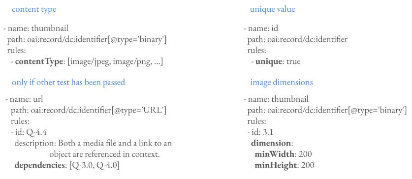 In the rule definition only the ‘address’ or the data element is different. Both are expressed with XPath. Note that in Dublin Core we check two distinct data elements with one ruleset.