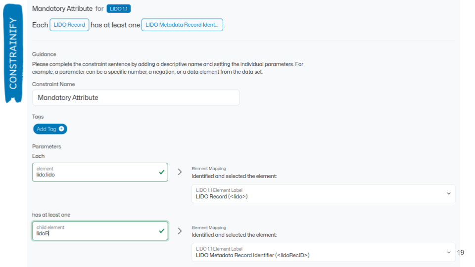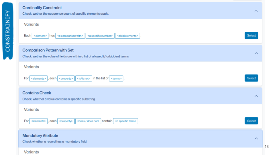 The Shacl4Bib approach eliminates the need of writing software code for validating the records, but still writing a configuration file is not a user friendly approach. Together with other quality assessment experts from the University of Marburg and Verbundzentrale des GBV (the maintainer of K10plus, the largest German union catalogue) within AQinDA project we work on a tool Constrainify that provides a ‘wizzard’ for metadata expert. Instead of starting from scratch the users can select human readable sentences typical in constraints definition, such as ‘For element X, each property Y does or does not contain a specific term.’ These sentences were distilled from documents describing metadata requirements created previously by partners such as DDB, KBR, Europeana and British Library.