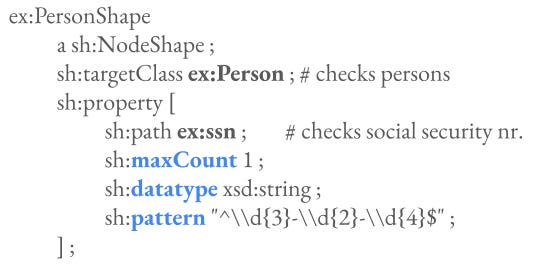 The Shapes Constraint Language (SHACL) is a formal language for validating RDF graphs against a set of conditions. The problem SHACL tries to solve is that semantic web builds on the open world assumption, shortly: we do not have a schema that provides restrictive rules about statements in a given context. SHACL and its implementations provide a dictionary and machinery to create such rules, and validate statements against them. This is a simple example. The PersonShape defines rules of Person nodes. Each person should have one and only one (maxCount is set to 1) social security number (denoted as ‘ssn’), that should be a string (the datatype property), and match a regular expression: 3 numbers, dash, 2 numbers, dash, 4 numbers (the pattern property).