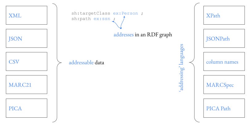 Most of these properties are meaningful for other data types. What is really semantic web specific is how SHACL tells which data element (the nodes and properties in an RDF graph) we should take care of. We have however similar mechanisms that can select a data element in non semantic web data: we have XPath for XML, JSONPath for JSON, column names for tables, even core bibliographical metadata schemas and serialization format have such tools, MARCSpec for MARC and UNIMARC, and Pica Path for PICA. With orchestrating these existing tools it is possible to implement the non RDF specific subset of SHACL to a wider range of data.