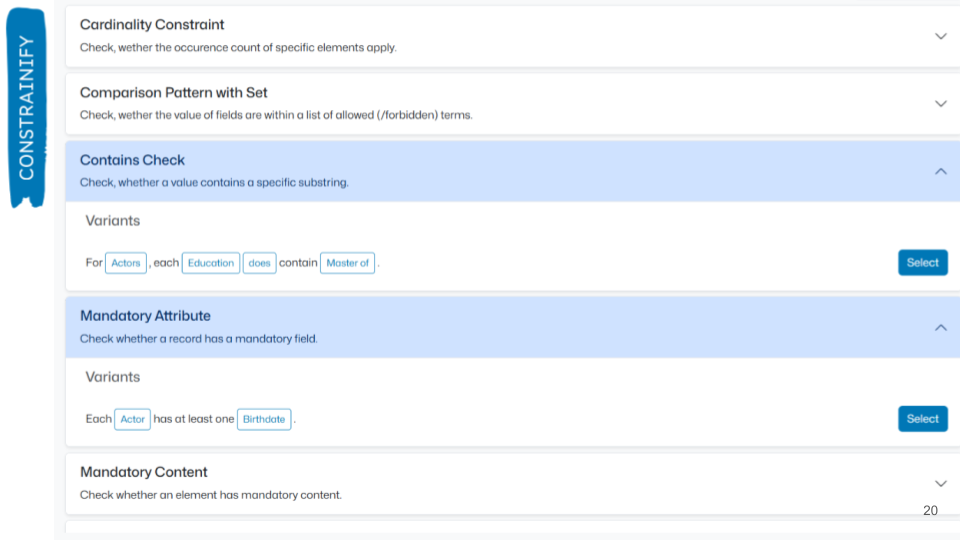 Once filled, the user has constraints like ‘Each Actor has at least one Birthdate’ or ‘For Actors each Education contains “Master of”’. The user then can execute the validation with the selected constraints, visit reports.